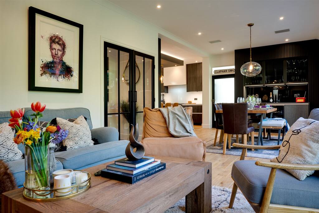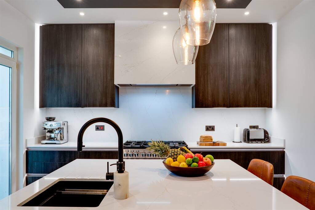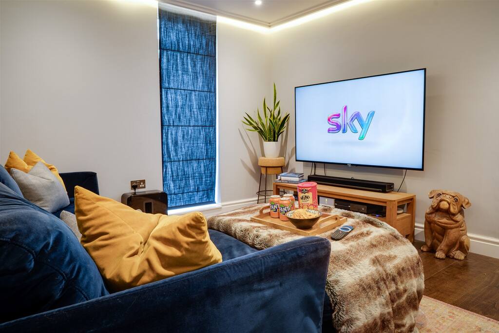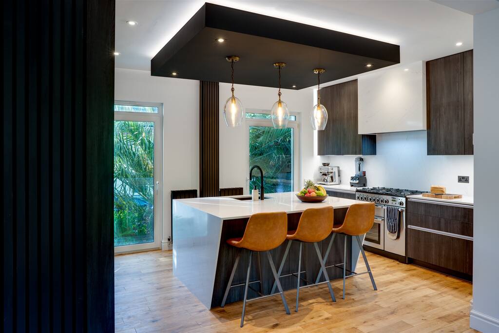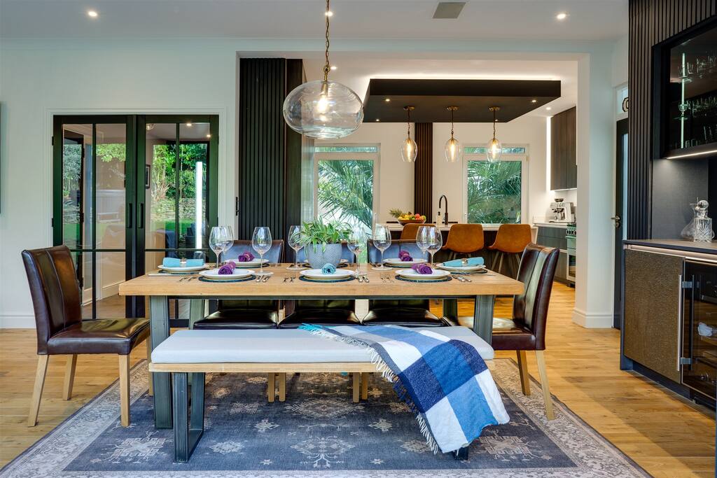 The home includes: Kitchen – Fully equipped designer kitchen w/ breakfast bar, two tall fridges, freezer, Range cooker Garden – Hot tub, BBQ, outdoor dining area Living area – Large bi-fold doors, log burner, 42 inch TV, Sky TV, Netflix & Prime, Sonos speaker system Dining area – Open plan, 8 seater dining table, wine cooler, bar area Master bedroom – Super king size bed, 42 inch TV, en-suite bathroom w/ walk-in shower + 2 person jacuzzi spa, walk-in wardrobe Bedroom 2 – King size bed w/ wardrobe + drawers, TV, Jack + Jill ensuite bathroom Bedroom 3 – King size bed w/ drawers, Jack + Jill ensuite bathroom Family bathroom – Large bath, walk-in shower, his + her sinks Snug – 65 inch Sky TV, Netflix + Prime, Sonos surround sound Parking – Private parking (1 car) and ample free parking on road Utility room – Washing machine, dryer, large American fridge w/ice machine Study – 2 separate work desks (iMac in photo not included) Downstairs toilet – Next to kitchen WIFI – Sky Broadband Ultrafast Fibre 145 MBPS