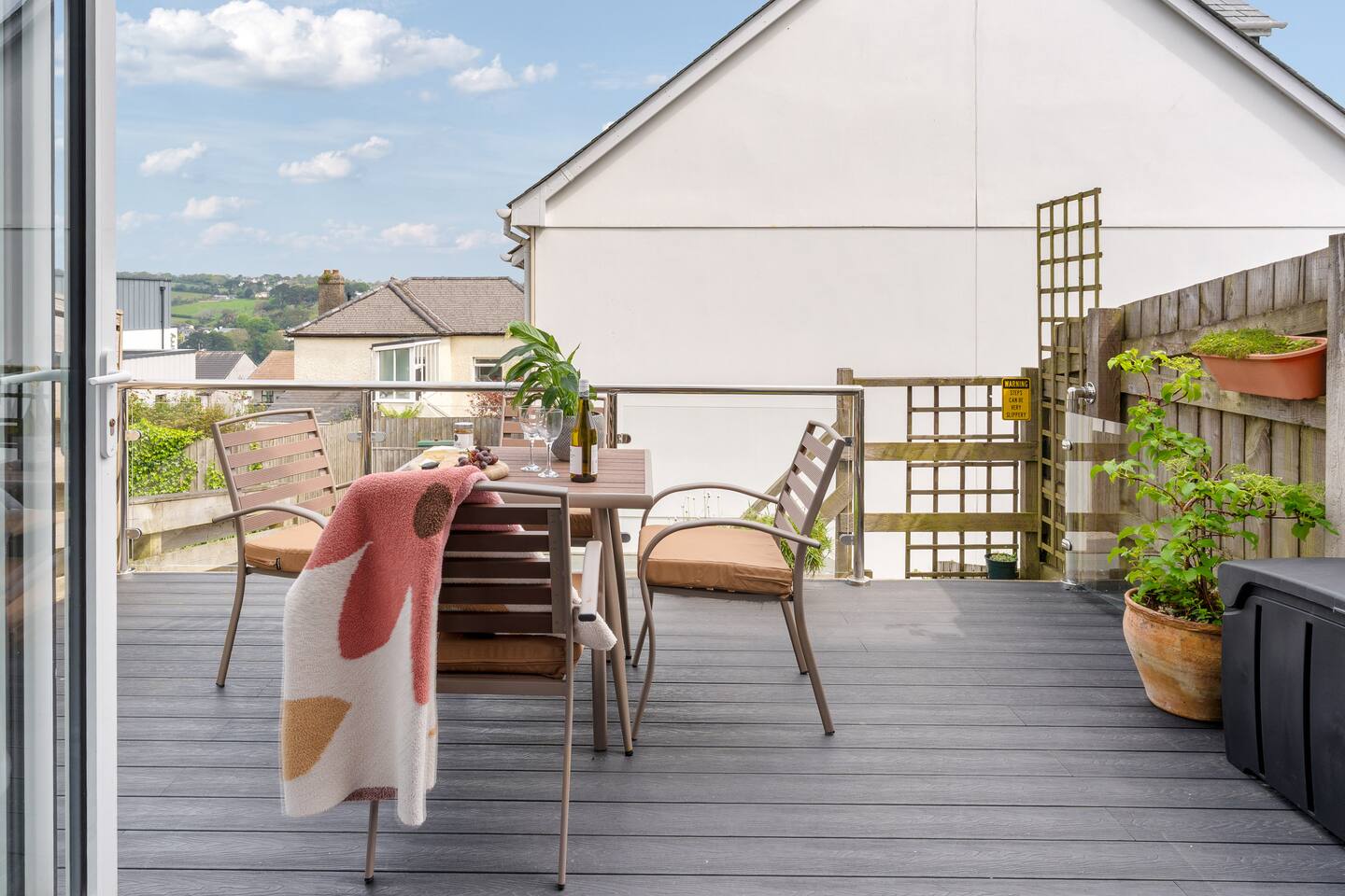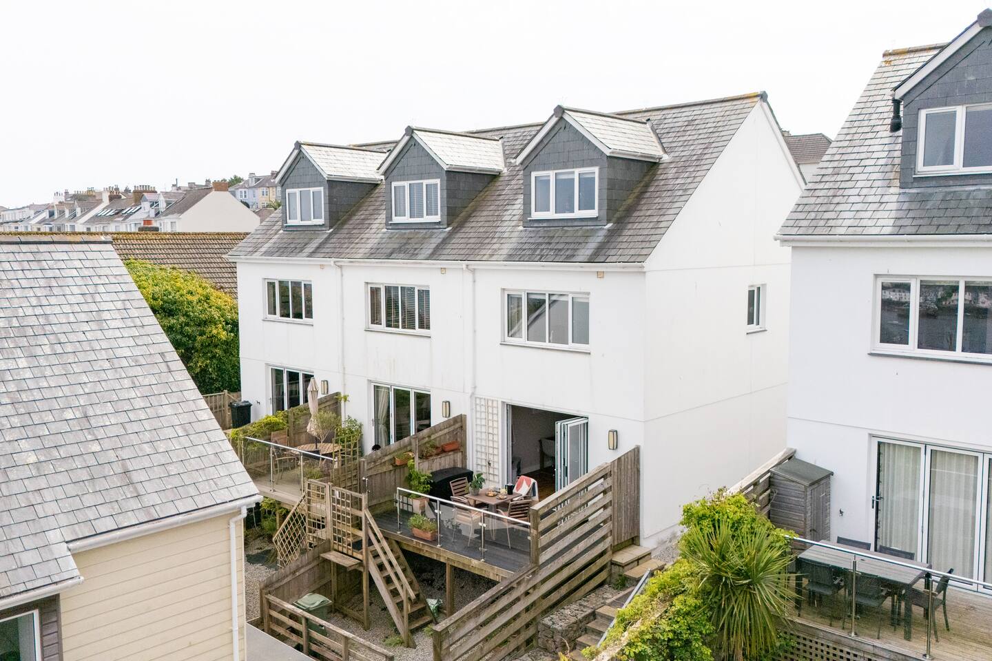 Welcome to your perfect Cornish retreat – a stylish three-storey home in a peaceful corner of Falmouth, just an 8-minute stroll from the town centre. Set over three floors, this spacious house sleeps 4 guests and offers stunning views over the harbour, Flushing, and even St Mawes Castle from the upper bedrooms. On the top floor, you'll find a luxurious super king bedroom with zip-link beds that can be configured as either a super king or two singles, offering flexible sleeping arrangements. This room also boasts an ensuite bathroom with a large walk-in-shower, and breathtaking panoramic views. The second bedroom features a comfortable king-size bed, while the third is a cosy single – ideal for families or small groups. On the ground floor, you’ll find a fully equipped kitchen and a stylish open-plan living and dining area – perfect for relaxing or gathering with family and friends. Bi-fold doors open out onto the beautifully decked terrace, ideal for dining alfresco or enjoying a quiet morning coffee. A convenient WC is also located on this floor. Inside, the home offers everything you need for a comfortable stay, including high-speed Wi-Fi, a TV, washing machine/dryer, and ironing facilities. Private off-road parking adds extra convenience in this popular harbour town. You'll be steps away from a wide array of restaurants, cafes, and shops. Explore nearby attractions including the vibrant Maritime Museum, historic Pendennis Castle, and beautiful Gyllyngvase Beach, all within walking distance. Whether you're seeking a relaxing getaway or an adventure-filled holiday, our home’s prime location offers easy access to all that Falmouth has to offer, rain or shine.